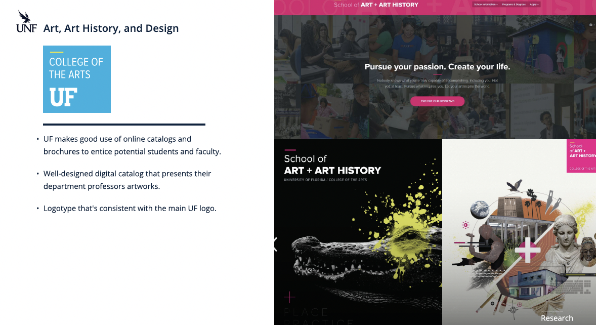 The team did competitive research on the art programs at UF, UCF, and our local competitor, FSCJ. This research aimed to define our objectives and innovate a solution that either hasn't been attempted previously or, if it has, to surpass existing standards.